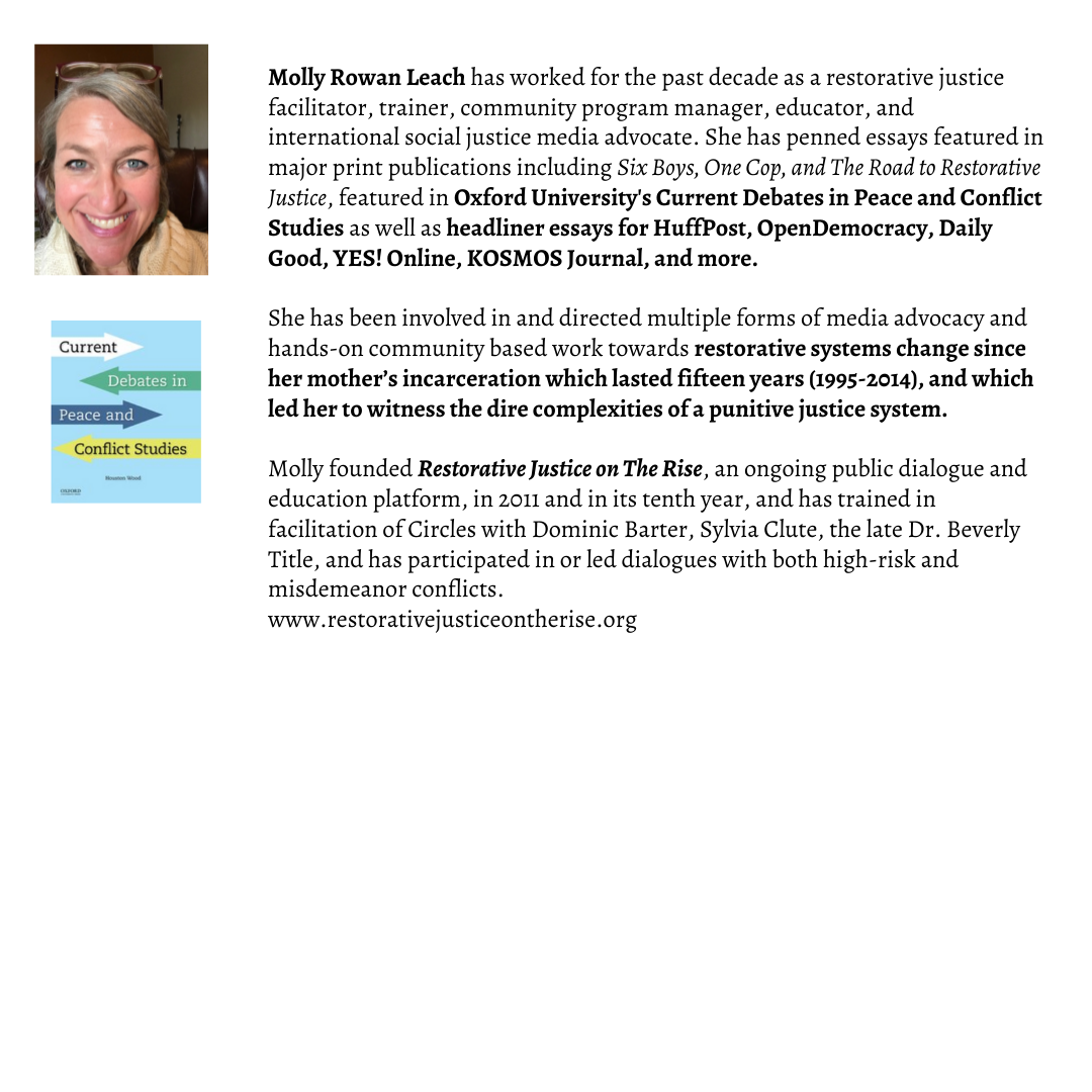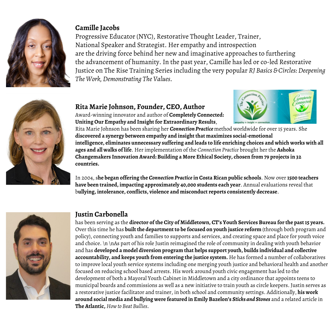 Hear from and interact with respected leadership in diverse pockets of restorative work within systems of all kinds--how they are helping support the difficult work of transforming systems into those that relate, connect, and humanize instead of isolate, punish, and shame.